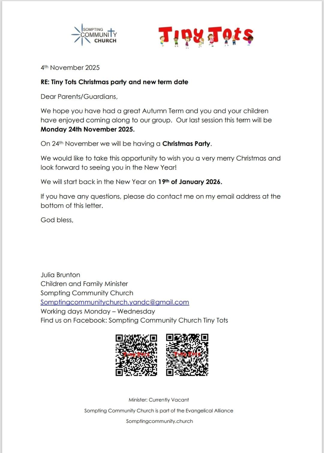Tiny Tots is our parent and child group that meets Mondays during term time from 10am-11:15am at St Peter's Church Hall, Bowness Avenue, Sompting. Each session provides a safe and supportive place for everyone to share parenting experiences, build connections with other parents, have fun, play with toys, make a craft and even the opportunity for a story or singing. There is a small charge for this group of £1.50 for each child. This includes a craft, drink, toast and helps to cover the rent of the hall.